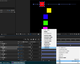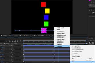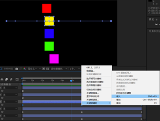 5.选定其中一层的三个关键帧,右击鼠标,在弹出的下拉式菜单中选中“关键帧辅助-时间反向关键帧”,对象将开始做逆向运动。