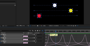 2.自上而下,白、黄、红三个小球分别位于三个图层,做两段往返直线运动。
