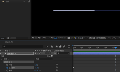 2.在“修剪路径1-结束”项的首、尾设置关键帧,将其值分别设定为0、100,得到一个延伸的直线动画效果。