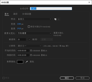 2.新建一个合成,参照手机界面设定尺寸及持续时间。