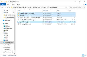 1.将TypeMonkey插件(包括一个主文件、两个文件夹)复制、粘贴至AE CC的ScriptUI Panels文件夹中。