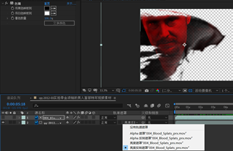 3.设置下方图层的“轨道遮罩”为“亮度反转遮罩……”,得到一个墨渍绽开的动画效果。