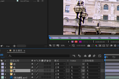 3.导入上面的JPG图片,并将其拖拽至图层,Ctrl+D复制三次,分别命名为灯、柱、楼、天,准备蒙板抠像。