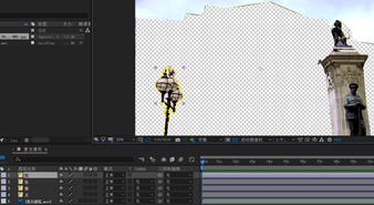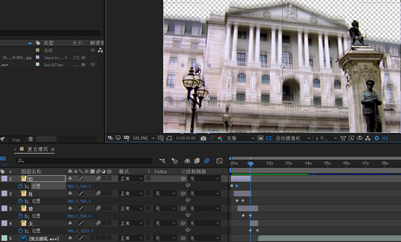 5.对四个图层对象统一制作运动动画,其中灯、柱、楼均是自上而下,天空则是相反。