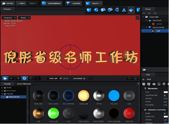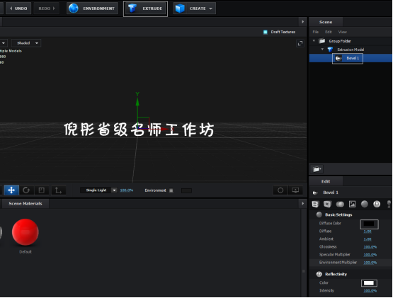 2.单击“EXTRUDE”(挤压)按键,将文字制作成三维效果。在右侧的“Scene”面板,可对斜面、倒角、颜色等进行设置。