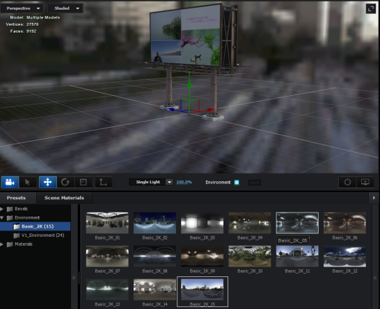 5.在左侧的“Presets”面板下选中“Environment”(环境)项的下级文件夹中的某个图片文件作为三维场景。