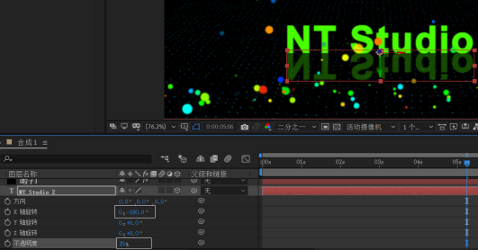 7.Ctrl+D复制文字图层,按R、Shift+T展开旋转和不透明度属性,将X轴旋转设置为-180、不透明度设置为29%左右,
