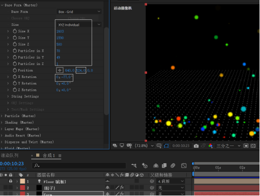 对粒子的数量( Particles/sec)、重力(Gravity)、滑动(Slide)再做最后一次微调,完成Particular特效设置。
