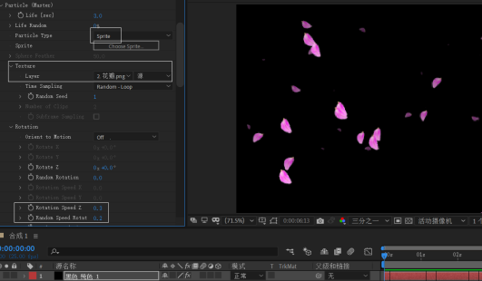 3.在“Particle”(粒子)项,设置 Sprite Type为“Sprite”,Texture/Layer为“花瓣”所在的图层,