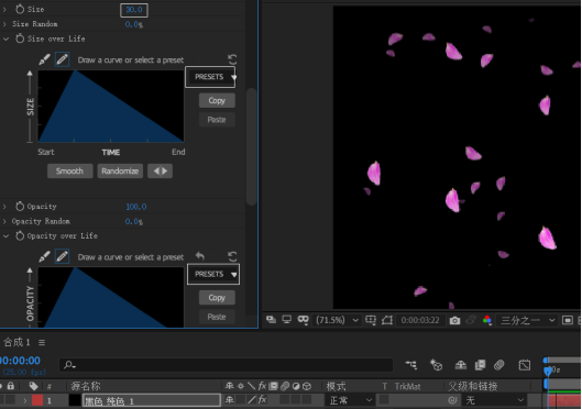 4.在“Particle”(粒子)项,继续设置 Size为30左右,Size over Life、Opacity over Life均选“预置”的形状,