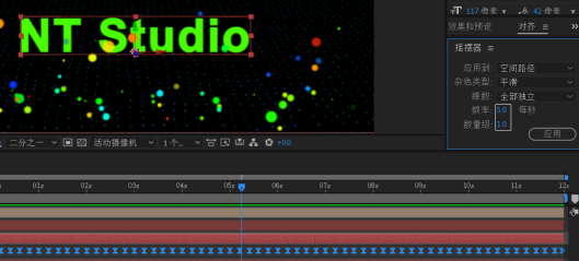 打开“摇摆器”功能面板,依默认参数设定,单击“应用”按钮,使文字产生轻微的摇摆动画。