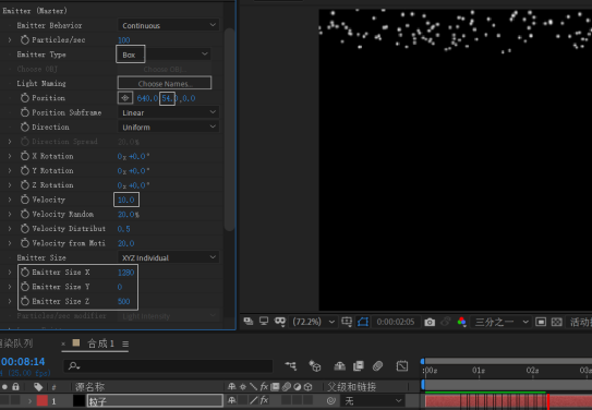 在“Emitter”(发射器)项,设置 Emitter Type为“Box”,Emitter Size X、Y、Z分别为1280、720、500左右。