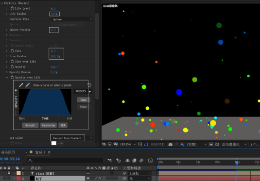 3.在“Particle”(粒子)项,设置Life Random为100%,Sphere Feather为2左右;Size、Size Random为8、100%左右;