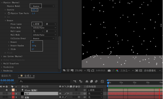 “Bounce”子项设置:Floor Layer为“底板”图层,Bounce、Bounce Random、Slide分别为40、100%、67左右。