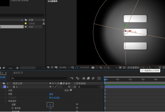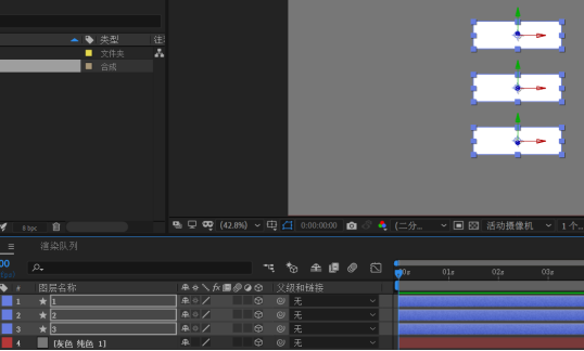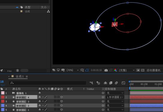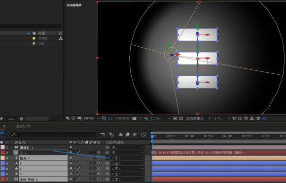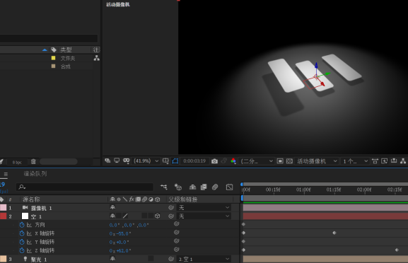 5.新建一个摄像机图层、一个空对象图层,将空对象层转换为三维图层,并设置成除摄像机图层之外图层的父级。
