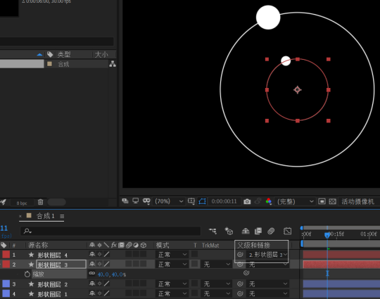 选定小球所在的图层,将其“父级和链接”设置为路径图层,按S键展开“缩放”属性,将路径图层缩小。