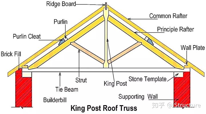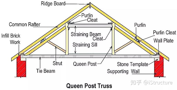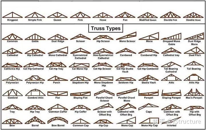 早期的三角桁架只有2根斜置上弦杆和1根水平下弦杆。而后,人们根据经验,尝试在三角形内部对应弦杆中间点的位置,增加了3根腹杆,演化出单柱式屋架(KingPost Truss)和双柱式屋架(QueenPost Truss) 两种基本形式。