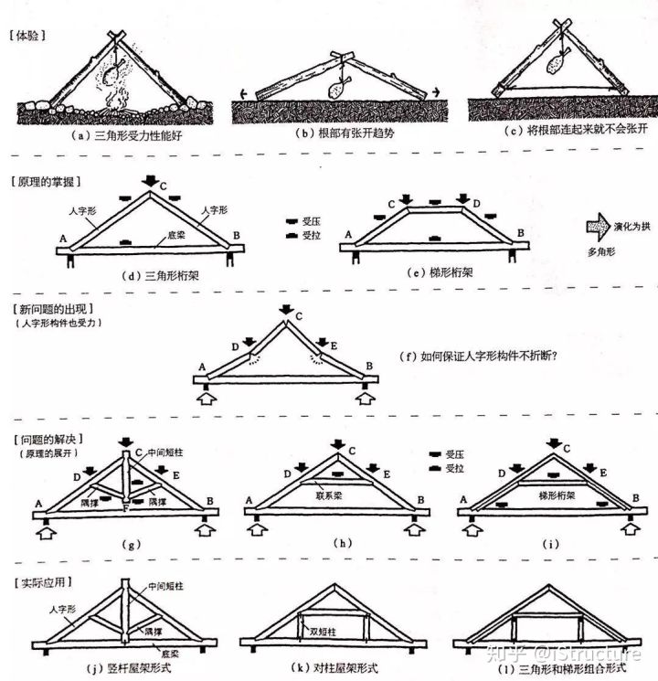 早在两千年前,人类的祖先就发现了三角形的稳定性原理,并发明了三角桁架,广泛应用在古代住房的木制屋盖中。三角桁架与梁、拱一样,是古代建筑实现跨越的最主要方法。