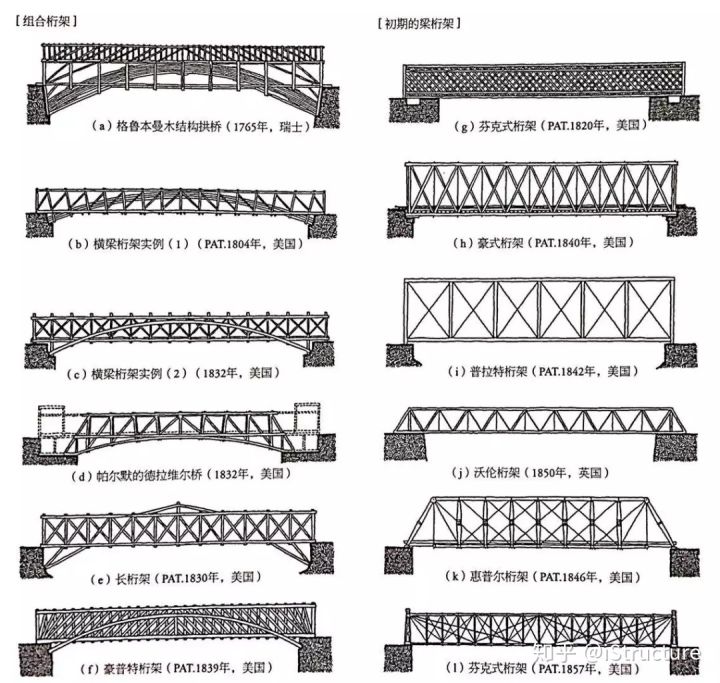 拱桥在均匀荷载下的承载力很大,但在火车的移动不均匀荷载下则产生很大变形。因此木桥普遍采用拱桥和增强刚架结合的形式。经过多次实践发现,只要把补强刚架做得足够坚固,甚至可以省去拱。于是各种新式的桁架纷纷出现,梁桁架的时代从此开始了。