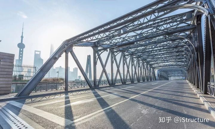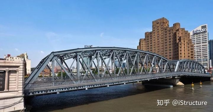 位于上海的外白渡桥是中国的第一座全钢结构铆接桥梁,于1908年1月20日落成通车。该桥为下承式简支钢桁架,两孔跨经组合各52.12米,桥面铺设电车轨道。
