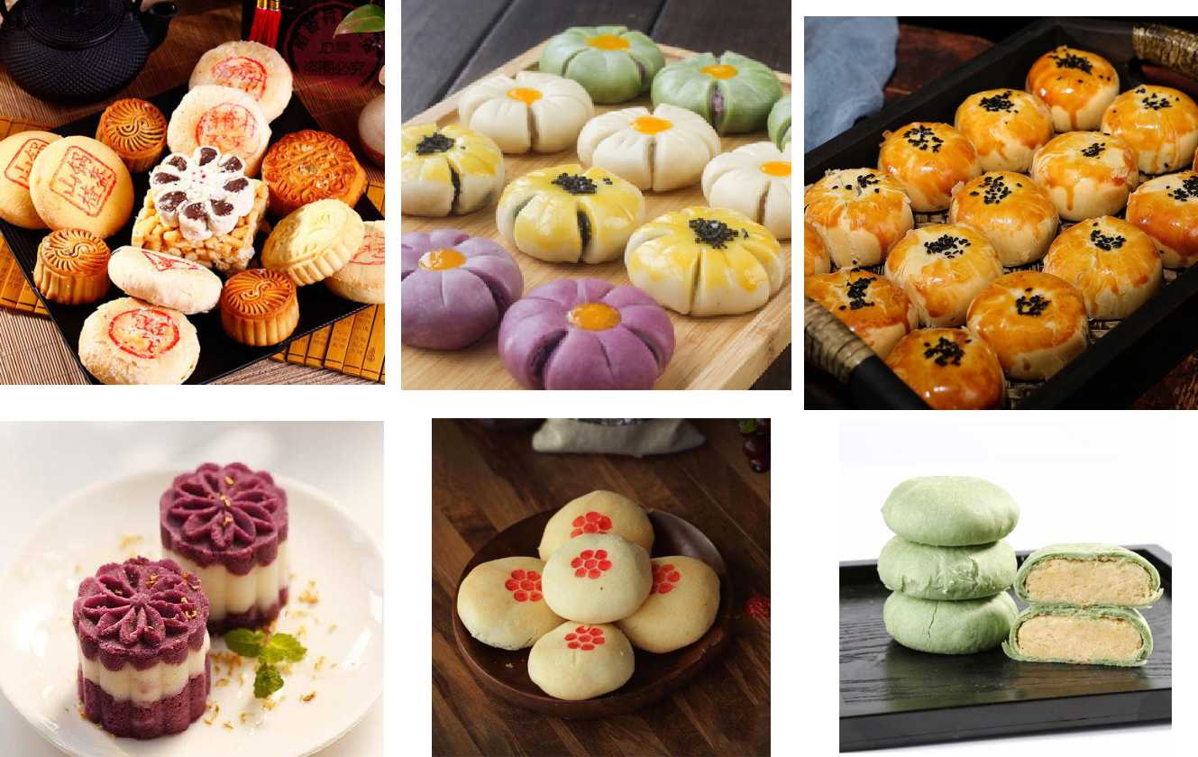 酥皮类:用水油面团包入油酥面团制成酥皮,经包馅、成形、烘烤而制成的饼皮分层次的制品,如京八件、苏八件、广式的莲蓉酥和苏式月饼等。