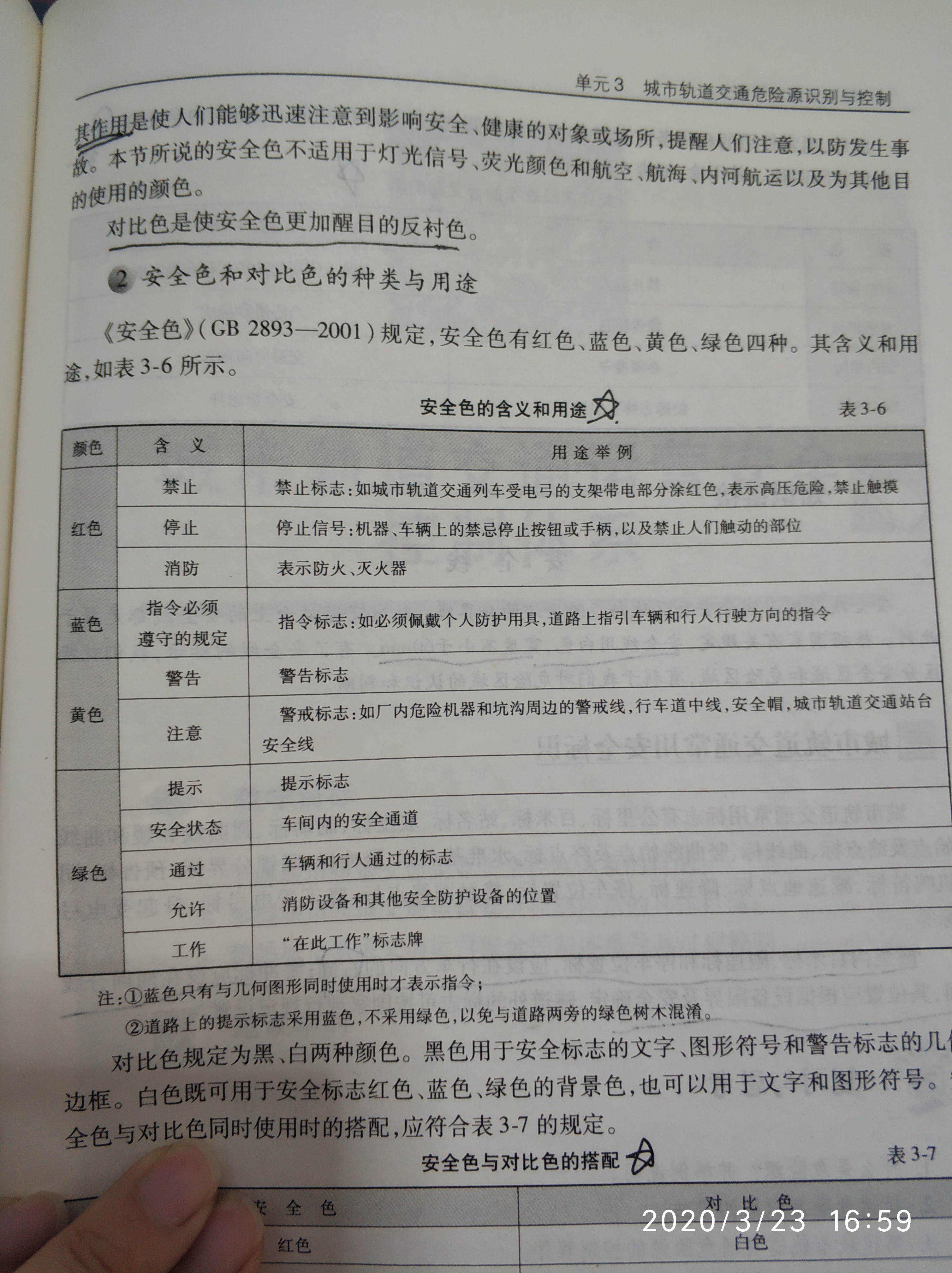 对比色规定为黑白两种颜色。黑色用于安全标志的文字,图形符号和警告标志的几何边框。白色既可以用于安全标志红色、绿色、蓝色的背景色也可以用于文字和图形符号。安全色与对比色同时使用搭配表。