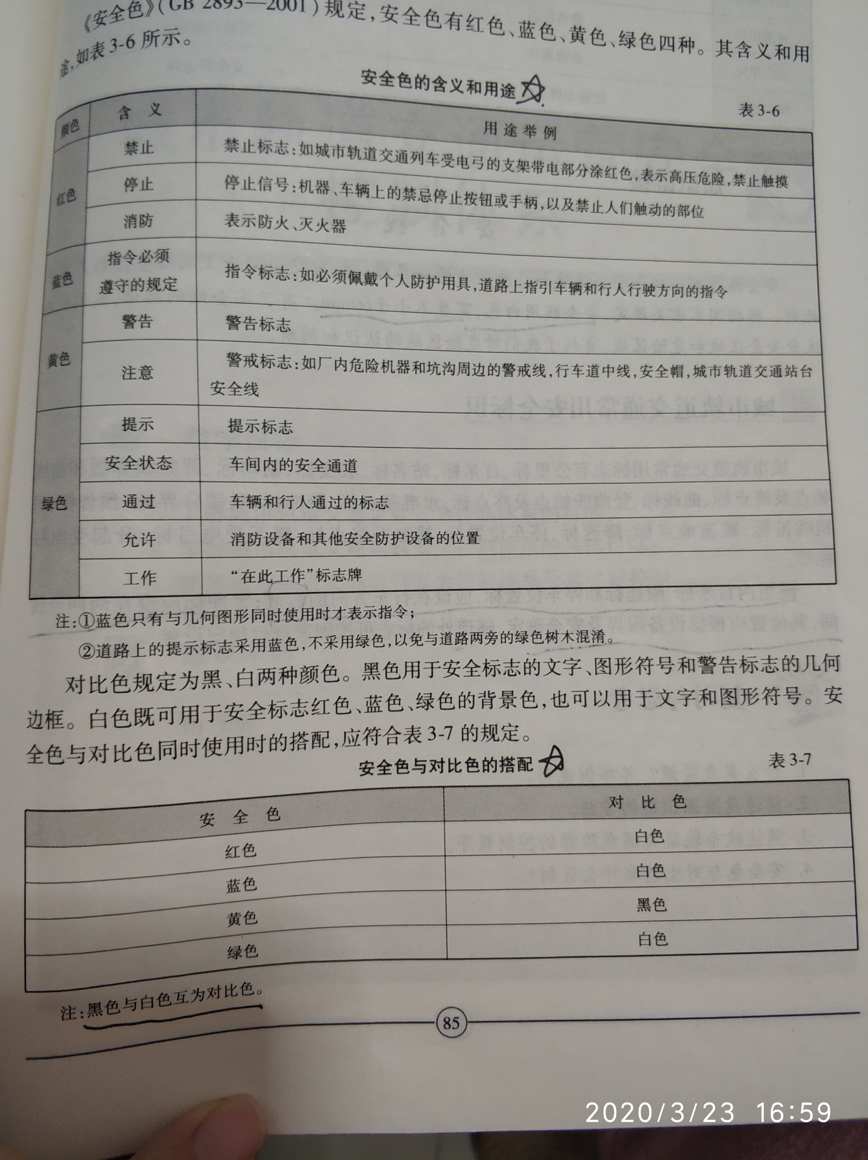 (3)安全色与对比色同时使用搭配表(除了黄色的对比色是黑色,其他安全色的对比色都是白色)