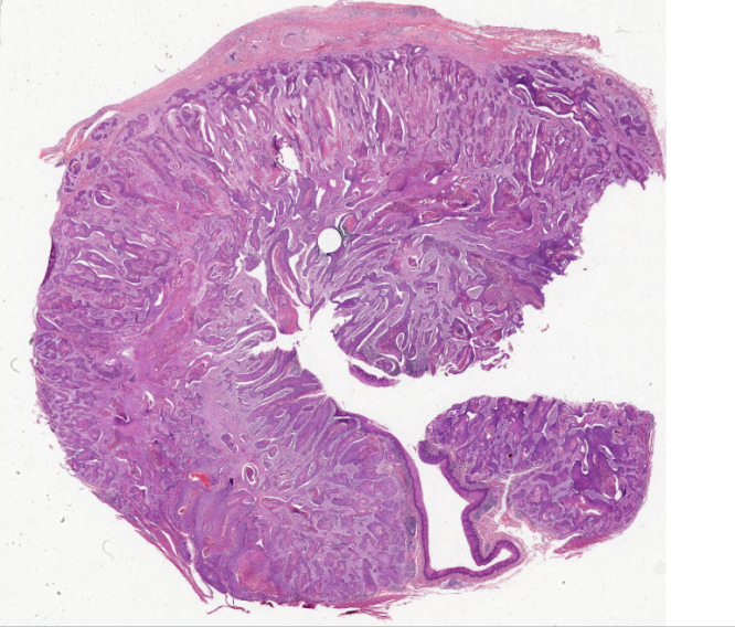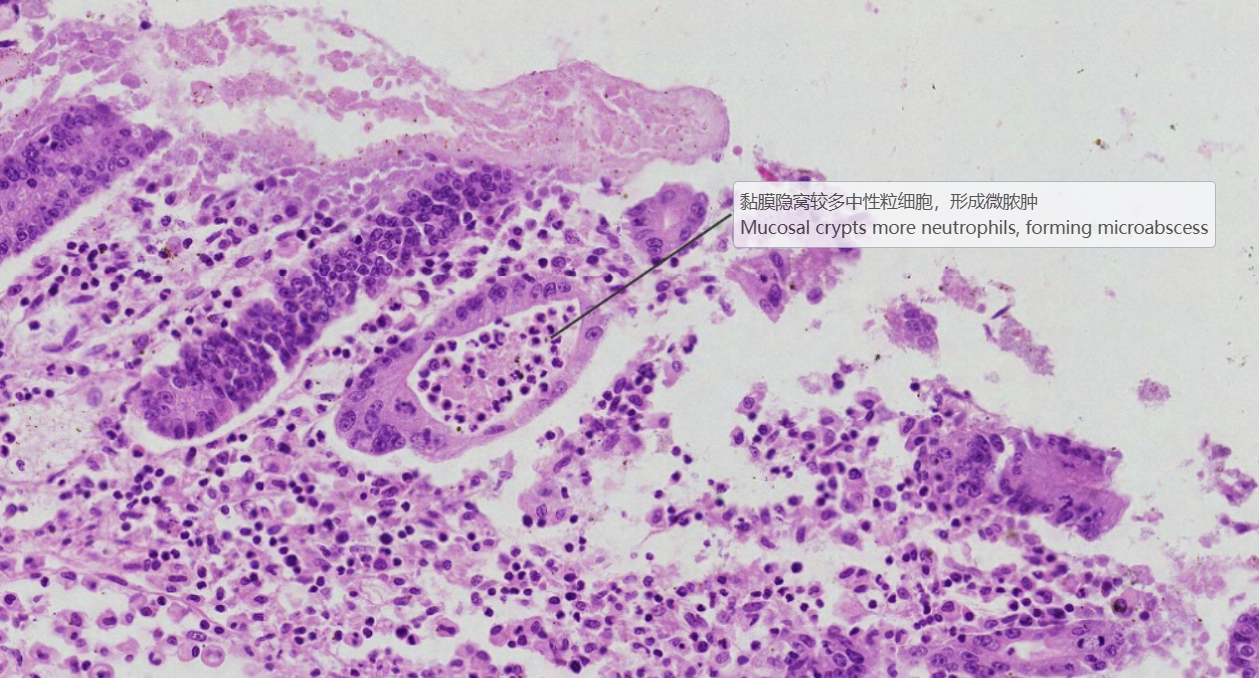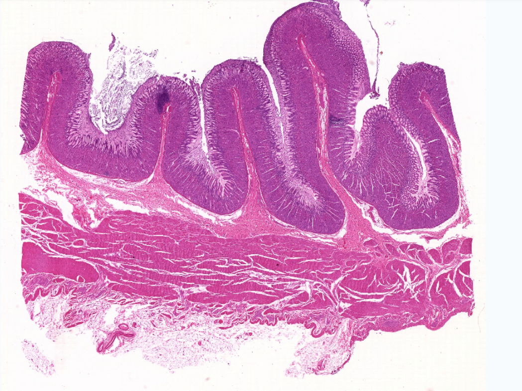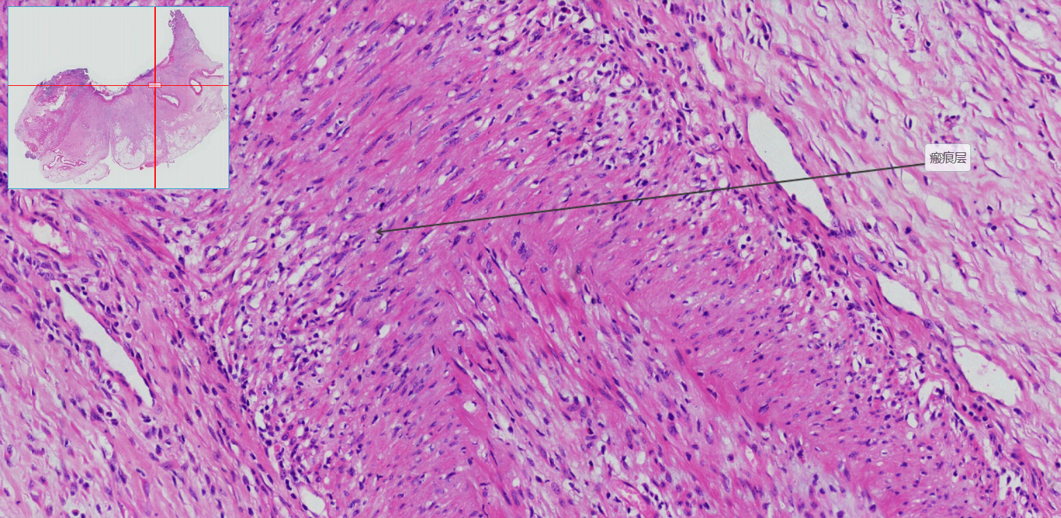 固有层突入上皮基底部形成乳头,有些地方因切面关系,乳头似在上皮内。黏膜肌层是一层纵行的平滑肌,