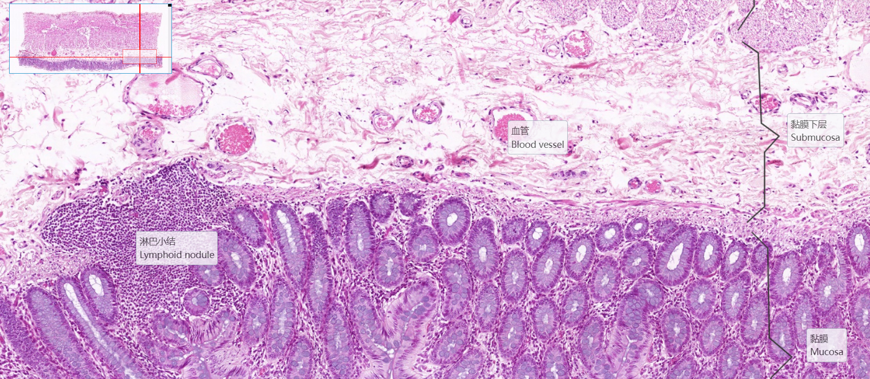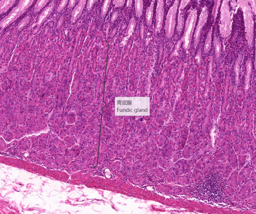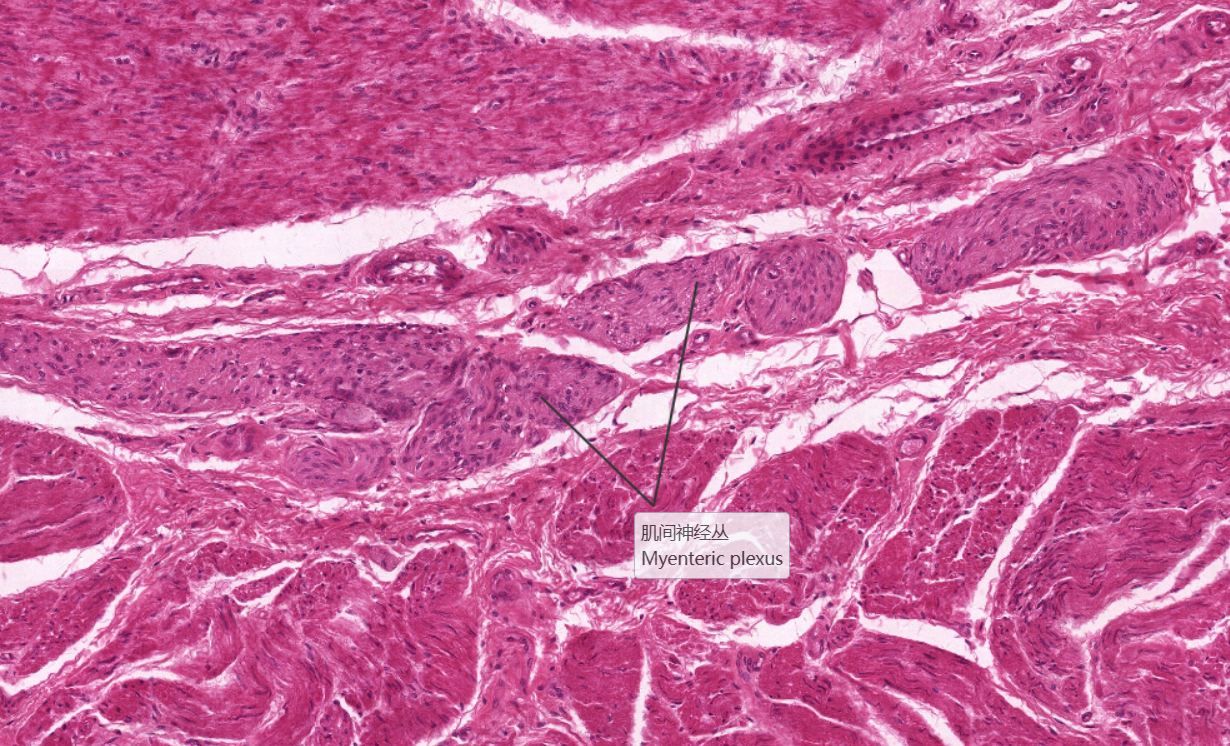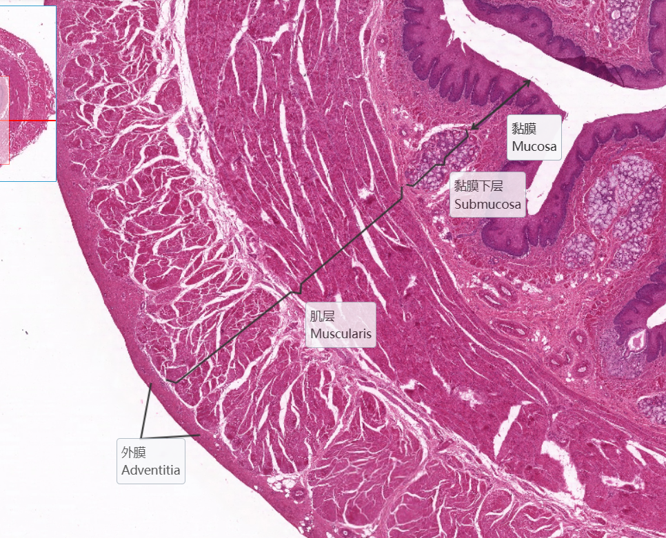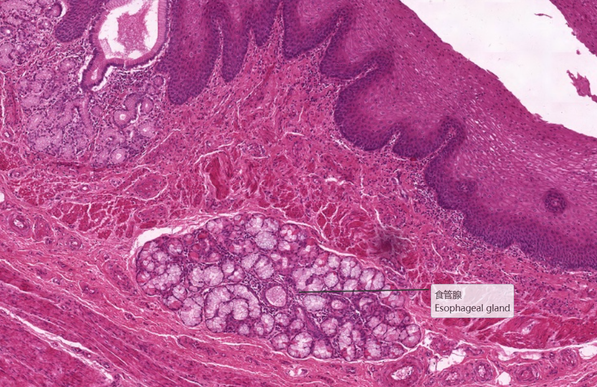 在食管横断面上肌细胞呈横断面。2、 黏膜下层:为疏松结缔组织,呈粉红色,纤维比较粗大,除细胞外,