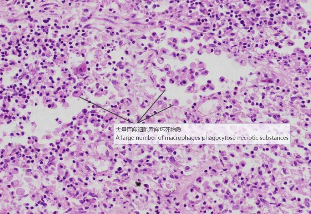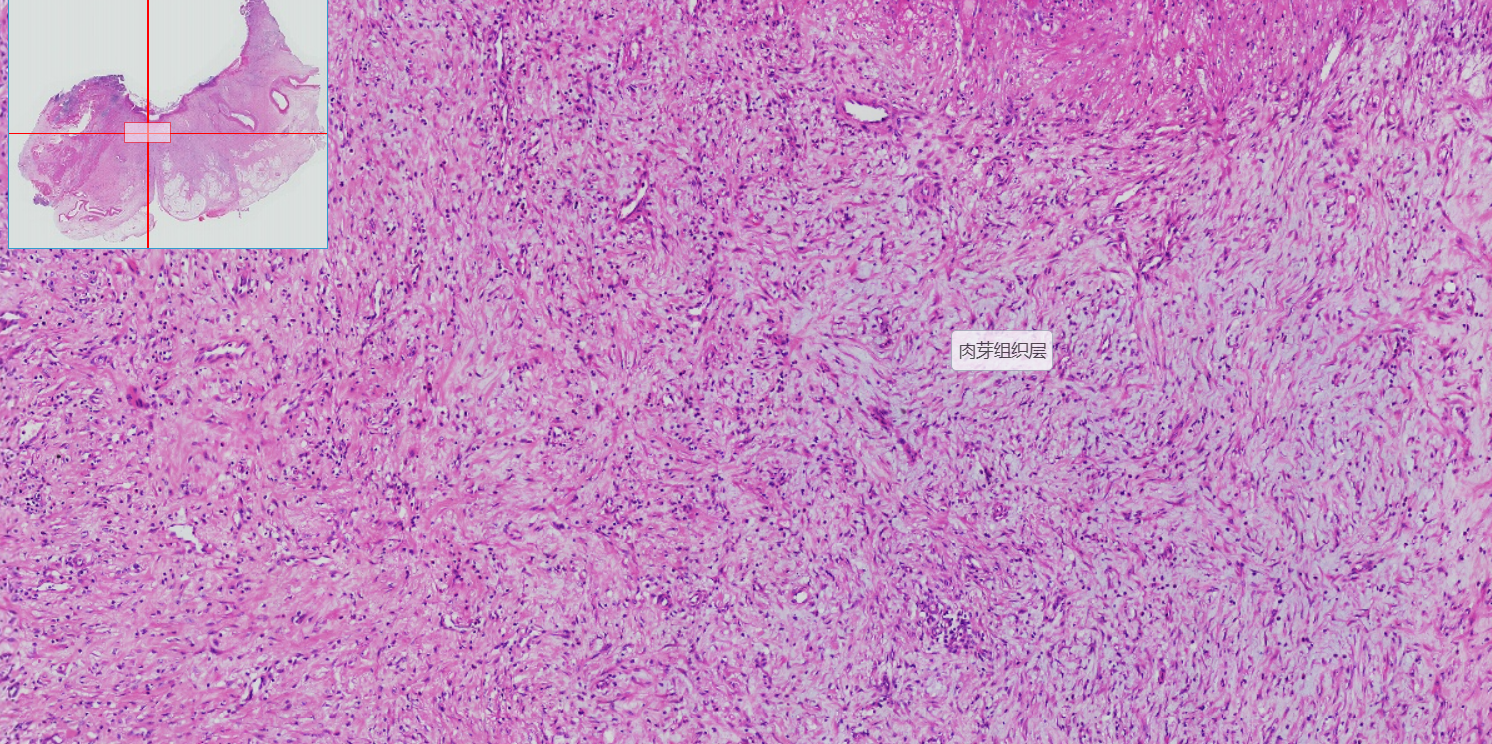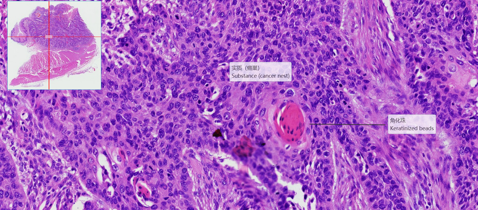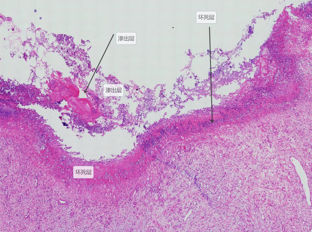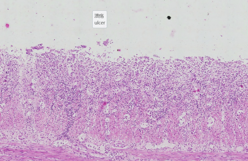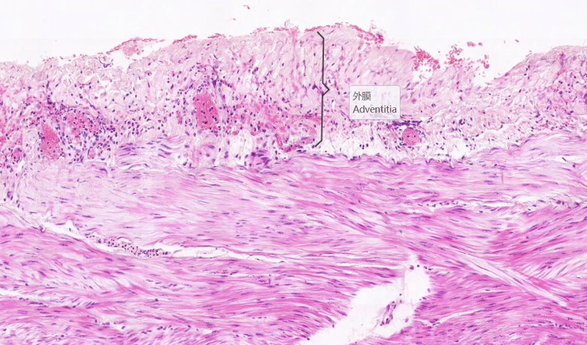 在食管横断面上肌细胞呈横断面。2、 黏膜下层:为疏松结缔组织,呈粉红色,纤维比较粗大,除细胞外,