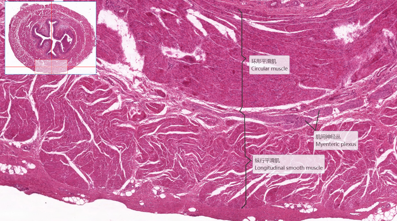 为骨骼肌。可分为两层,两层之间的结缔组织内有肌间神经丛。