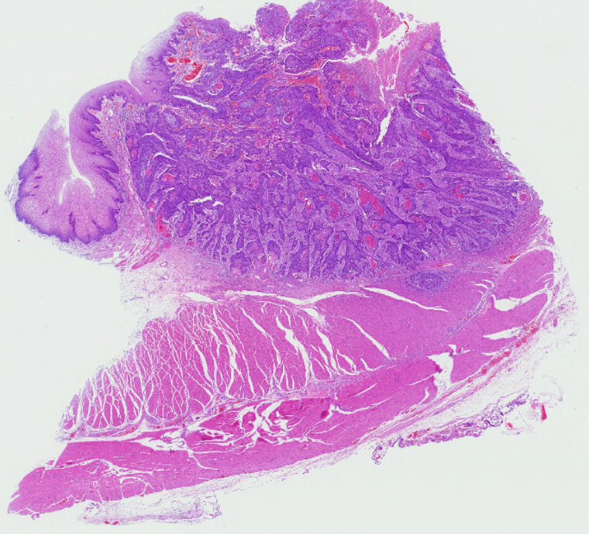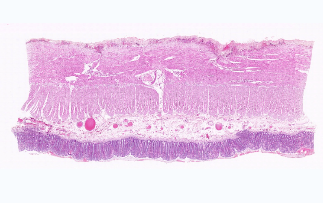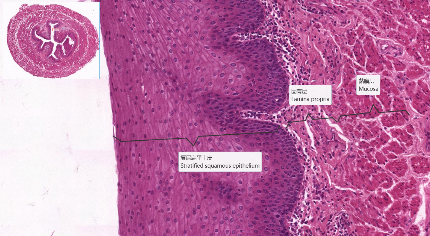 低倍镜观察:观察食管壁四层结构,即黏膜、黏膜下层、肌层和外膜。1、 黏膜:上皮为复层扁平上皮。