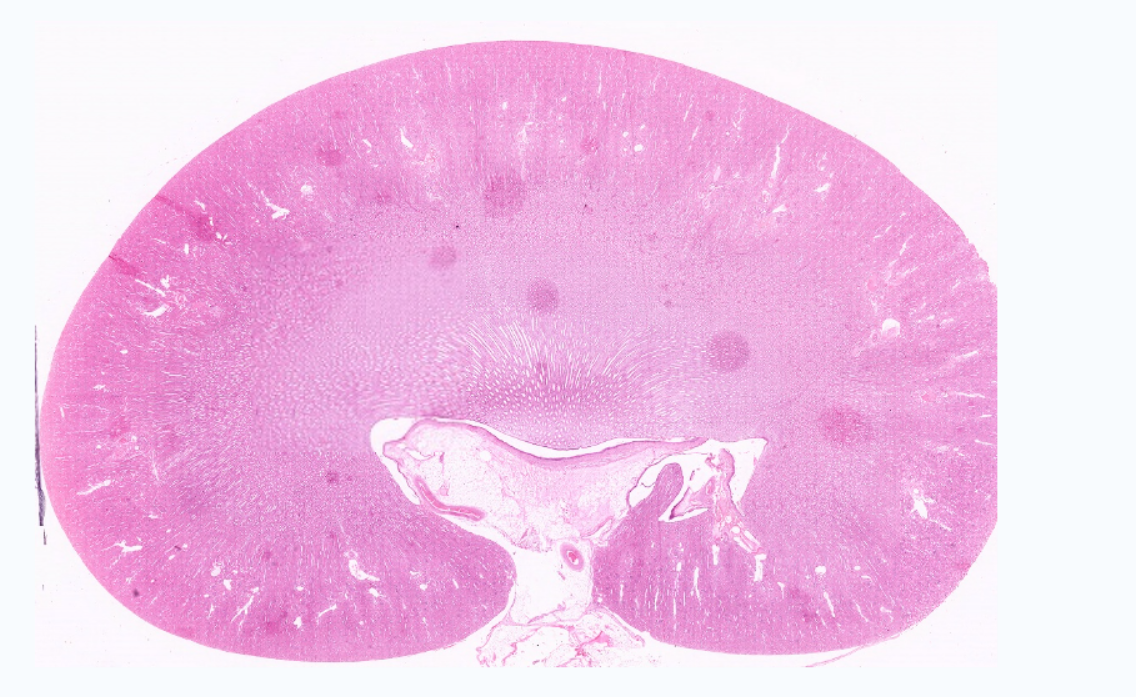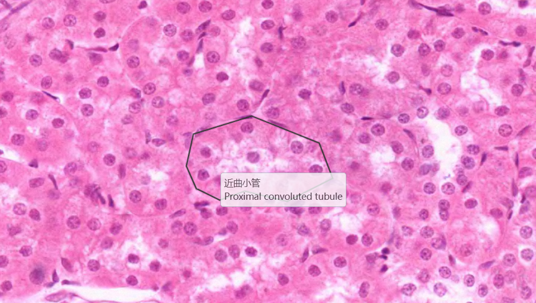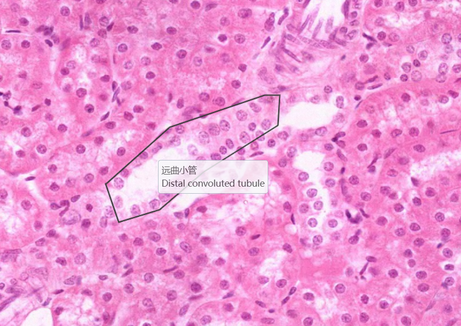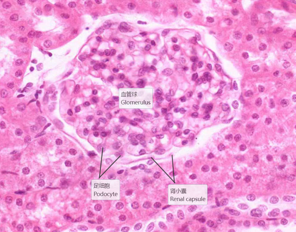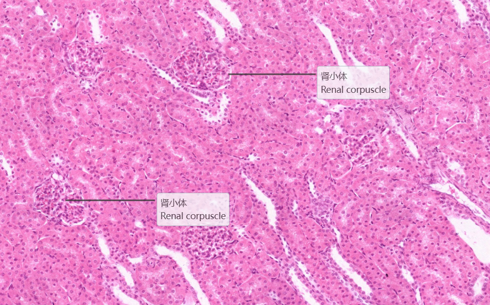 低倍镜:分辨被膜、皮质和髓质。高倍镜:(1)肾小体,由血管球和肾小囊组成。肾小囊壁层为单层扁平上皮,脏层为足细胞包在血管球的表面,在切片上不容易分出。两层上皮之间为肾小囊腔。(2)近曲小管在肾小体的周围,管腔小凹凸不平不规则,管壁厚,上皮细胞较大,分界不清,核圆,位于近基底部,胞质强嗜酸性,呈深红色,游离面有刷状缘。(3)远曲小管也在肾小体的周围,与近曲小管相比,官腔相对较大而规则,上皮细胞较小,分界较清楚,核圆,位于中央或近腔面,胞质弱嗜酸性,呈浅红色,游离面无刷状缘。(4)细段在近肾乳头部易找到。细端管腔小,管壁为单层扁平上皮,但比毛细血管内皮稍厚。(5)致密斑为远曲小管靠近肾小体侧的上皮细胞形成的椭圆形斑。该上皮细胞呈高柱状,胞质色浅,核椭圆排列紧密。