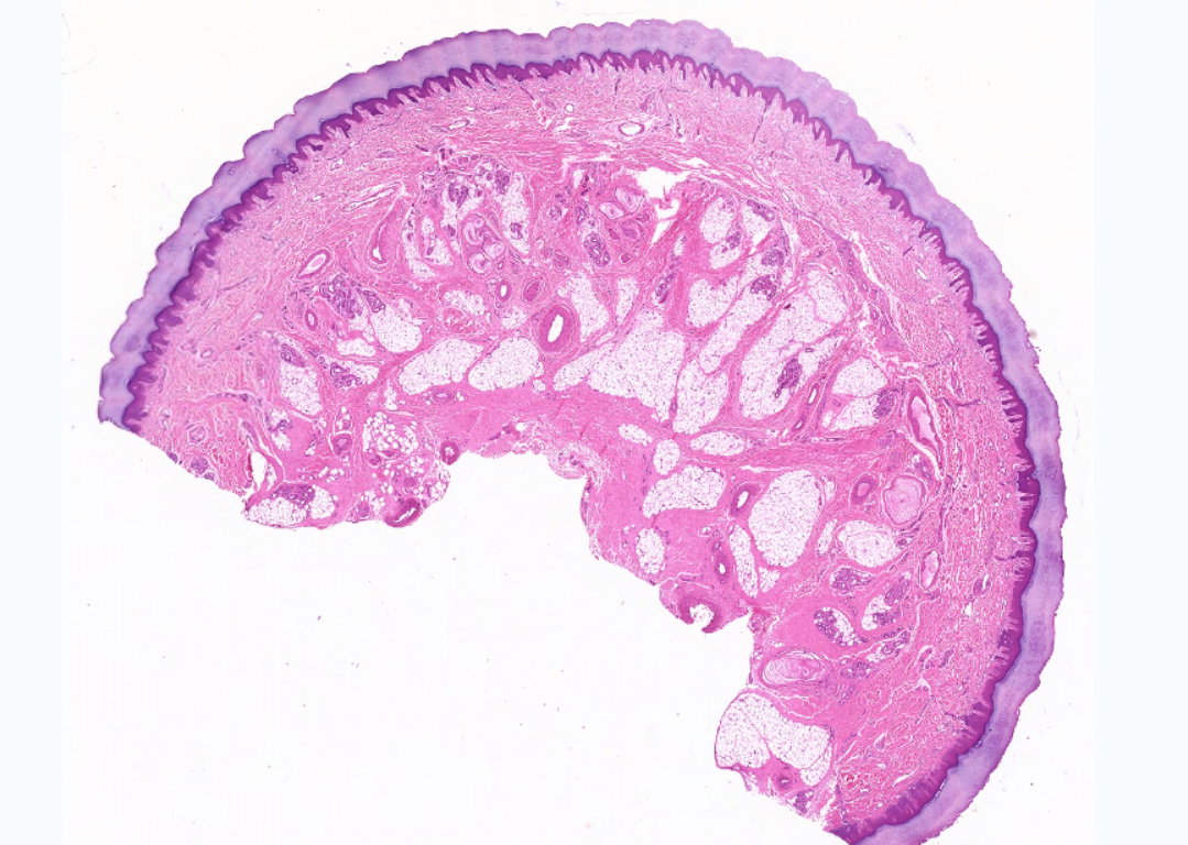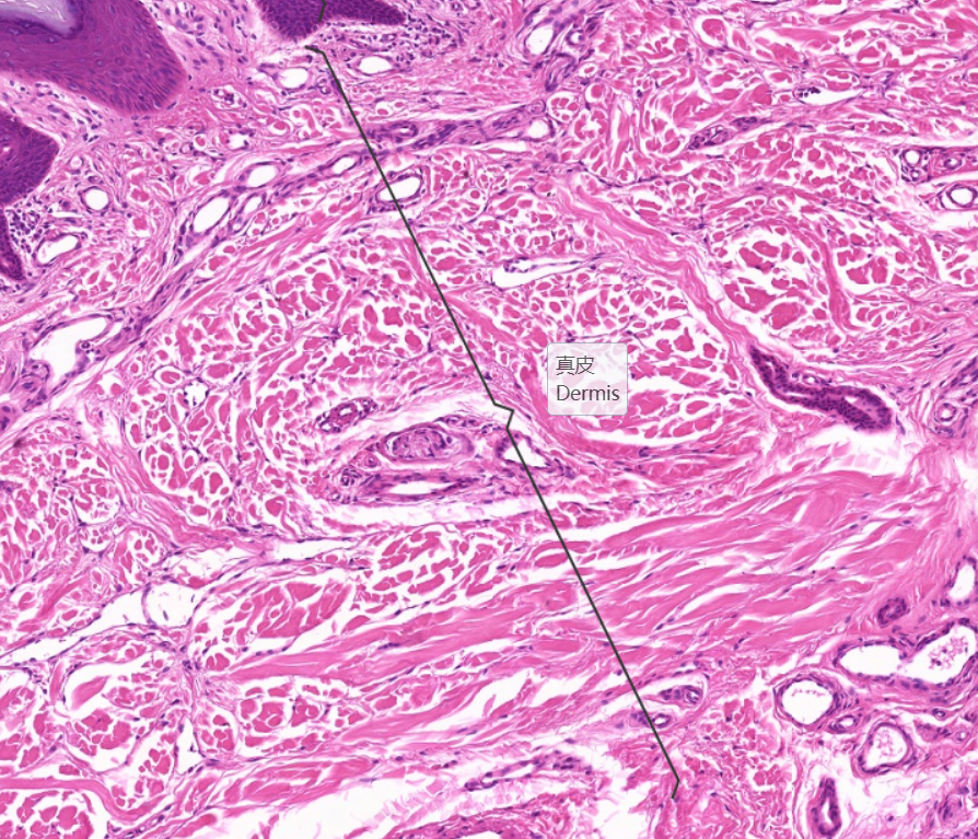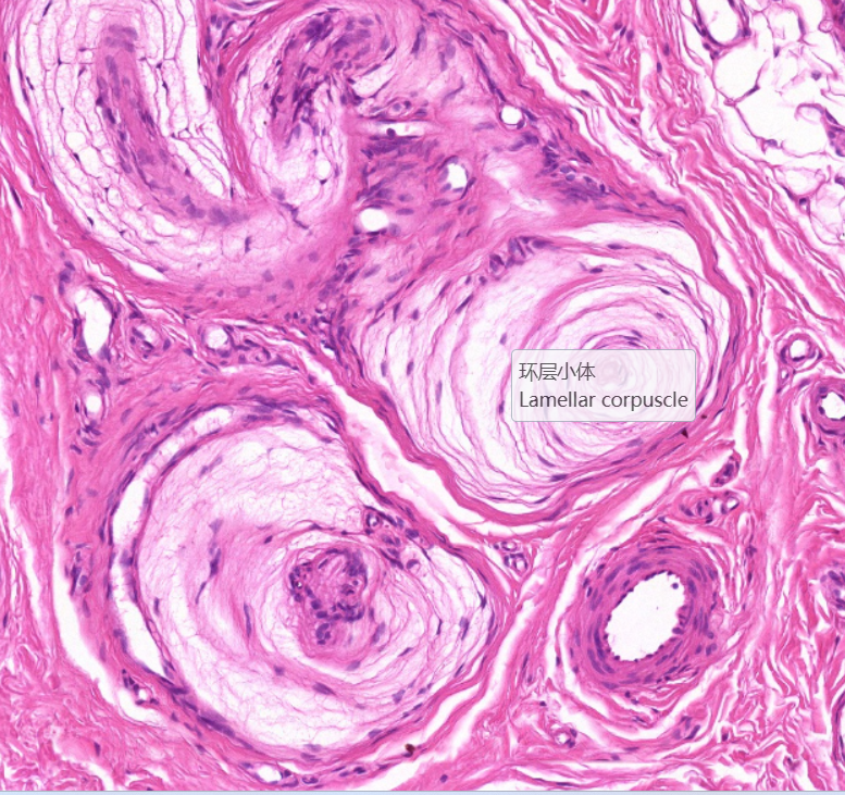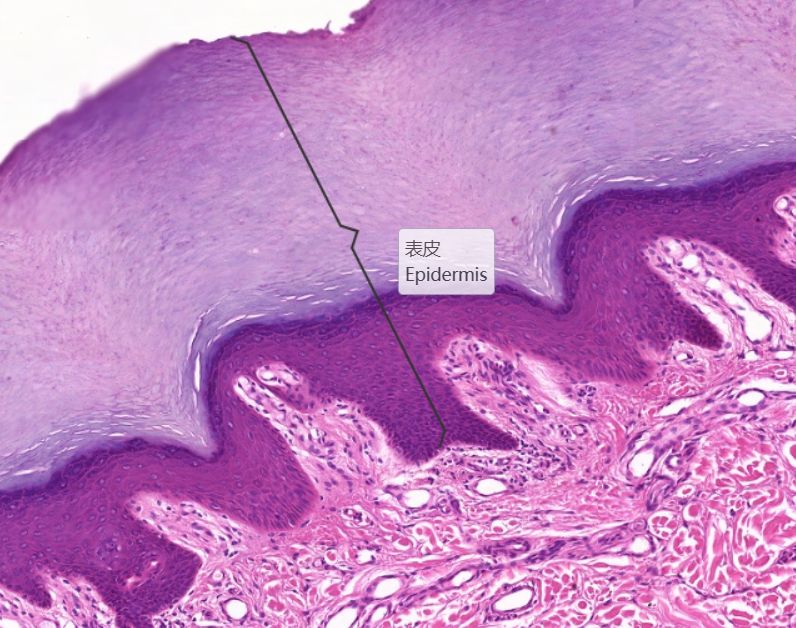 低倍镜观察:表皮:为角化的复层扁平上皮,表层红色为角化层,蓝紫色色的为表皮其他各层。真皮:为结缔组织,两者交界处凹凸不平,真皮靠近表皮部分由疏松结缔组织构成,称乳头层,结缔组织向表皮深面形成乳头状隆起为真皮乳头。有些可见触觉小体。乳头层下方较厚的致密结缔组织为网状层。网状层深面是脂肪组织或少量疏松结缔组织为皮下组织,两者无明显界限,皮下组织内可见成团的汗腺导管和分泌部、血管、神经及环层小体。高倍镜观察:表皮:典型的结构自基底至表面可分为五层。