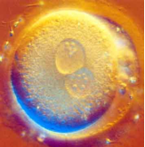 ③精子头侧面的细胞膜与卵子细胞膜融合,随即精子的细胞核及细胞质进入卵子内,精子与卵子的细胞膜融合为一体。精卵结合后,卵子浅层胞质内的皮质颗粒立即释放酶类.使透明带结构发生变化,特别是使ZP3 分子变性,不能再与精子结合,从而阻止了其它精子穿越透明带,这一过程称透明带反应(zona reaction)。这一反应保证了正常的单精受精。(偶尔,也有两个精子同时进入卵子,然而,三倍体的胚胎或者中途流产,或者出生后夭亡。)同时,卵子迅速完成第二次减数分裂,排出一个第二极体。此时精子和卵子的细胞核分别称为雄原核(male pronucleus)和雌原核(female pronucleus)。两个原核逐渐在细胞中部靠拢,核膜消失,染色体混合,形成二倍体的受精卵(fertilized ovum),又称合子(zygote),受精过程到此完成。