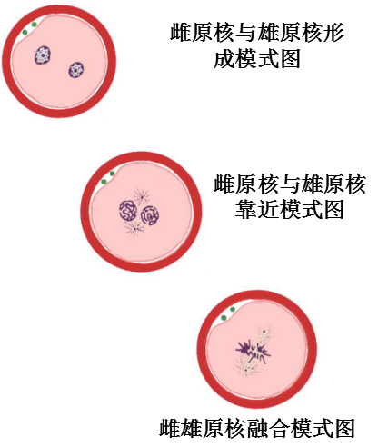 ①雌原核与雄原核形成;②雌原核与雄原核靠近;③雌雄原核融合并开始卵裂;