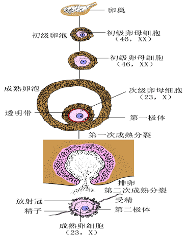 从卵巢排出的卵子处于第二次减数分裂的中期(仍为2 倍体细胞),进入并停留在输卵管壶腹部。当与精子相遇,受到精子穿入其内的激发,卵子才完成第二次减数分裂。若未受精,则在排卵后12~24 小时退化。