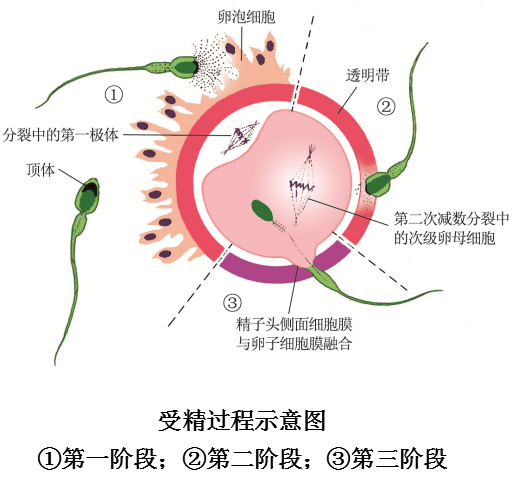 ①当大量获能的精子接触到卵子周围的放射冠时.即开始释放顶体酶,解离放射冠的卵泡细胞,这样部分精子可径直接触到透明带。