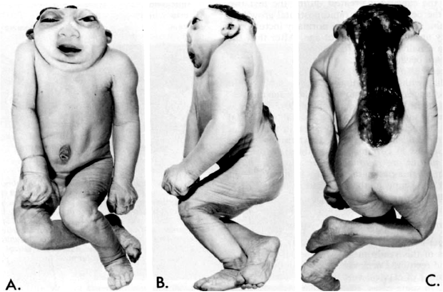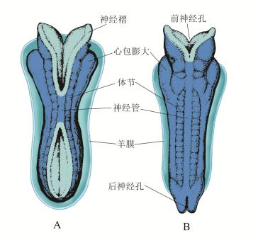 神经管:中枢神经系统的原基,头端→脑,尾端→脊髓,以及松果体、神经垂体和视网膜等。如果前、后神经孔未愈合,将会分别导致无脑畸形和脊髓裂。