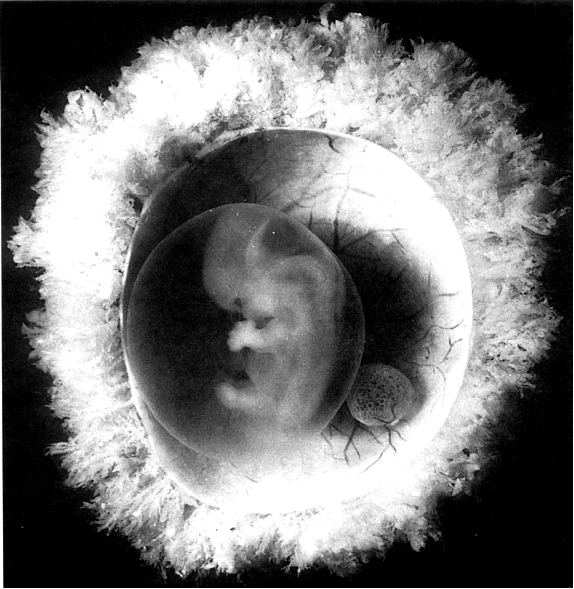 1.绒毛膜(chorion) 由滋养层和衬于其内面的胚外中胚层组成。植入完成后,滋养层已分化为细胞滋养层和合体滋养层两层。继之细胞滋养层局部增殖,伸入合体滋养层内,形成许多绒毛状突起,这样,外表的合体滋养层和内部的细胞滋养层构成了初级绒毛干。第3 周时,胚外中胚层逐渐伸入绒毛干内,改称次级绒毛干。此后,绒毛干胚外中胚层的间充质分化为结缔组织和血管,并与胚体内的血管相通,此时改称三级绒毛干。各级绒毛干的表面都发出分支,形成许多细小的绒毛。同时,绒毛干末端的细胞滋养层细胞增殖,穿出合体滋养层,伸抵蜕膜组织,将绒毛干固着于蜕膜上。这些穿出的细胞滋养层细胞还沿蜕膜扩展,彼此连接,在绒毛膜表面形成一层细胞滋养层壳,使绒毛膜与子宫蜕膜牢固连接。原滋养层陷窝演变为绒毛干之间的绒毛间隙,间隙内充满来自子宫螺旋动脉的母体血,绒毛浸浴其内,胚胎通过绒毛汲取母血中的营养物质并排出代谢产物。绒毛膜包在胚胎及其它附属结构的最外面,直接与子宫蜕膜接触。大量绒毛的发育使绒毛膜与子宫蜕膜的接触而增大,有利于胚胎与母体间的物质交换。胚胎早期,整个绒毛膜表面的绒毛均匀分部。之后,由于包蜕膜侧的血供匮乏,绒毛逐渐退化、消失,形成表面无绒毛的平滑绒毛膜(smooth chorion)。基蜕膜侧的血供充足,该处绒毛反复分支,生长茂密,称丛密绒毛膜(villous chorion),它与基蜕膜一起组成胎盘。丛密绒毛膜内的血管通过脐带与胚体内的血管通连。此后,随着胚胎的发育增长及羊膜腔的不断扩大,羊膜、平滑绒毛膜和包蜕膜进一步凸向子宫腔,最终与壁蜕膜融合,子宫腔消失。在绒毛膜发育过程中,若血管发育不良或与胚体血管未通连,胚胎可因缺乏营养而发育迟缓或死亡。如滋养层细胞过度增生,绒毛内结缔组织变性水肿,血管消失,胚胎发育受阻,绒毛呈水泡状或葡萄状,称水泡状胎块或葡萄胎。如滋养层细胞癌变,则称绒毛膜上皮癌。