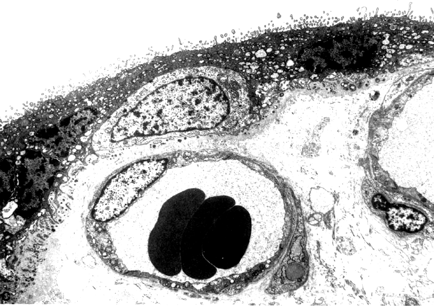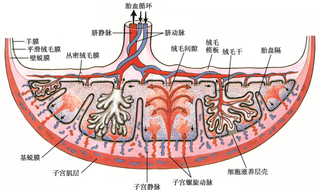 2.胎盘的血液循环和胎盘膜 胎盘内有母体和胎儿两套血液循环系统。母体动脉血从子宫螺旋动脉流入绒毛间隙,在此与绒毛内毛细血管的胎儿血进行物质交换后,再经子宫静脉,流回母体。胎儿静脉性质的血经脐动脉及其分支,流入绒毛毛细血管,与绒毛间隙内的母体血进行物质交换,从而成为动脉性质的血,后经脐静脉回流到胎儿。母体和胎儿的血液在各自的封闭管道内循环,互不相相混,但可进行物质交换。胎儿血与母体血在胎盘内进行物质交换所通过的结构,称胎盘膜(placentaI membrane)或胎盘屏障(placental barrier)。早期胎盘膜由合体滋养层、细胞滋养层和基膜、薄层绒毛结缔组织及毛细血管基膜和内皮组成。发育后期,由于细胞滋养层在许多部位消失,以及合体滋养层在一些部位仅为一薄层胞质,故胎盘膜变薄,胎血与母血间仅隔以绒毛毛细血管内皮和薄层合体滋养层及两者的基膜,更有利于物质交换。