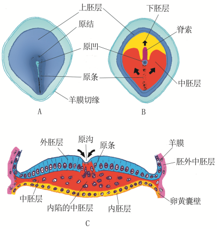 第3 周初,部分上胚层细胞增殖较快,在上胚层正中线的一侧形成一条增厚区,称原条(primitive streak)。原条的头端略膨大,为原结(primitive node)。继而在原条的中线出现浅沟,原结的中心出现浅凹,分别称原沟(primitive groove)和原凹(primitive pit)。原沟深部的细胞在上、下胚层之间向周边扩展迁移,一部分细胞则在上、下两胚层之间形成一个夹层,称胚内中胚层,即中胚层(mesoderm),它在胚盘边缘与胚外中胚层衔接;一部分细胞进入下胚层,并逐渐全部置换了下胚层的细胞,形成一层新的细胞,称内胚层(endoderm)。