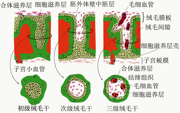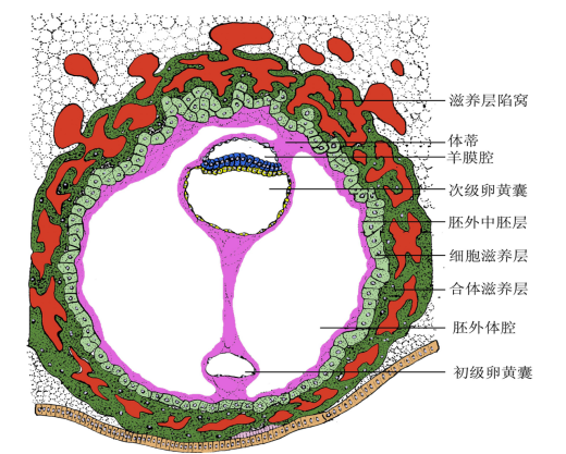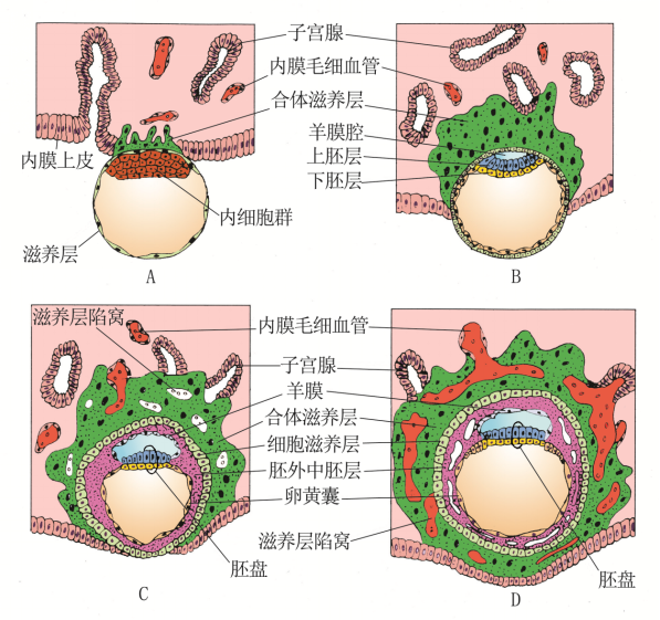 植入约于受精后第5~6 天开始,于第11~12 天完成。植入时,透明带已完全溶解消失,内细胞群侧的滋养层首先与子宫内膜接触,分泌蛋白水解酶,在内膜溶蚀出一个缺口,然后胚泡陷入缺口,逐渐被包埋其中。在植入过程中,与内膜接触的滋养层细胞迅速增殖,滋养层增厚,并分化为内、外两层。外层细胞互相融合,细胞间界线消失,称合体滋养层(syncytiotrophoblast);内层细胞界限清楚,由单层立方细胞组成,称细胞滋养层(cytotrophoblast)。后者的细胞通过分裂使细胞数目不断增多,并补充、融入合体滋养层。胚泡全部植入子宫内膜后,缺口修复,植入完成。这时胚泡的整个滋养层均分化为两层,并迅速增厚。在合体滋养层内出现一些小的腔隙,称滋养层陷窝,因与子宫内膜的小血管相通,其内充满母体血液。