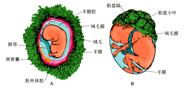 胎膜和胎盘是胚胎生长发育过程中形成的一些临时性结构,不参与胚胎本体的形成,对胚胎的生长发育起保护、营养、排泄、呼吸、内分泌等作用。胎儿娩出后,胎膜、胎盘即与子宫分离并被排出体外,总称衣胞(afterbirth)。