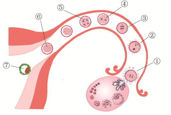 ①排卵;②受精;③第一次卵裂;④2细胞;⑤4细胞;⑥桑椹胚;⑦胚泡