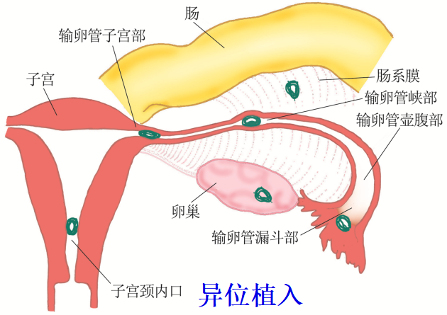 胚泡的植入部位通常在子宫的体部和底部,最多见于后壁。若植入位于近子宫颈处,在此形成的胎盘,称前置胎盘(placenta previa),分娩时胎盘可堵塞产道,导致胎儿娩出困难。若植入在子宫以外部位,称宫外孕(ectopic pregnancy),常发生在输卵管,偶见于子宫阔韧带、肠系膜、子宫直肠陷窝,甚至卵巢表面。宫外孕胚胎多因营养供应不足,早期死亡;少数植入输卵管的胚胎发育到较大后,引起输卵管破裂和大出血。植入过程受母体雌激素和孕激素的精细调节,这些激素的正常分泌使子宫内膜保持在分泌期。若母体内分泌紊乱或受药物干扰,子宫内膜的周期性变化与胚泡发育不同步,植人便不能完成。胚泡的植入还需要有正常的子宫腔内环境。子宫有炎症或避孕环等异物,均可阻碍胚泡植入。