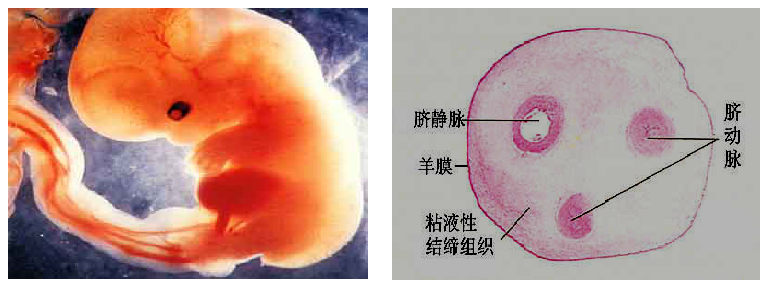 5.脐带(umbilical cord) 是连于胚胎脐部与胎盘间的索状结构。脐带外覆羊膜,内含粘液性结缔组织。结缔组织内除有闭锁的卵黄囊和脐尿管外,还有脐动脉和脐静脉。脐血管连接胚胎血管和胎盘绒毛血管。脐动脉有两条,因其长于脐带,故呈螺旋状走行。脐动脉将胚胎血液运送至胎盘绒毛血管,与绒毛间隙内的母体血进行物质交换。脐静脉仅有一条,将吸纳了丰富营养和氧的血液送回胚胎。胎儿出生时,脐带长40~1500px,粗1.5~50px。脐带过短,胎儿娩出时易引起胎盘过早剥离,造成出血过多;脐带过长,易缠绕胎儿四肢或颈部,可致局部发育不良,甚至造成胎儿窒息死亡。