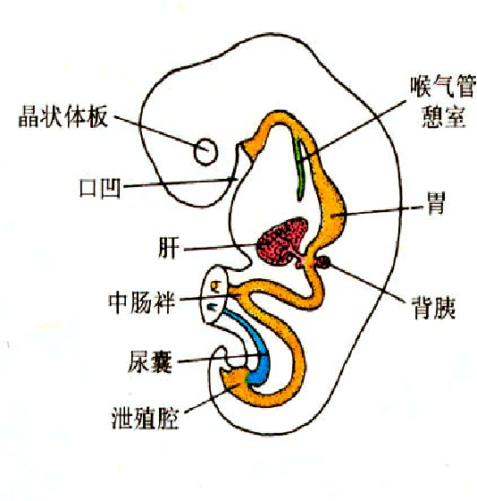 3.内胚层的分化 内胚层被包入胚体形成原始消化管,将分化为消化管、消化腺、呼吸道和肺的上皮组织,以及中耳、甲状腺、甲状旁腺、胸腺、膀胱等器官的上皮组织。