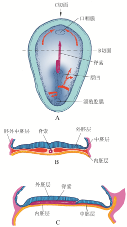 在内胚层和中胚层出现之后,原上胚层改称外胚层(ectoderm)。于是,在第3 周末,三胚层胚盘形成,三个胚层均起源于上胚层。原条的出现使胚盘能区分出头尾端、左右侧,出现原条的一端即为胚体的尾端。由于头端大,尾端小,此时的胚盘呈梨形。从原凹向头端增生迁移的细胞,在内、外胚层之间形成一条单独的细胞索,称脊索(notochord),它在早期胚胎起一定支架作用。在脊索的头侧和原条的尾侧,各有一个无中胚层的小区,此处的内、外胚层直接相贴,呈薄膜状,分别称口咽膜和泄殖腔膜。随着胚体的发育,脊索向头端生长。原条相对缩短,最终消失。若原条细胞残留,在未来人体骶尾部可增殖分化,形成由多种组织构成的畸胎瘤(teratoma)。