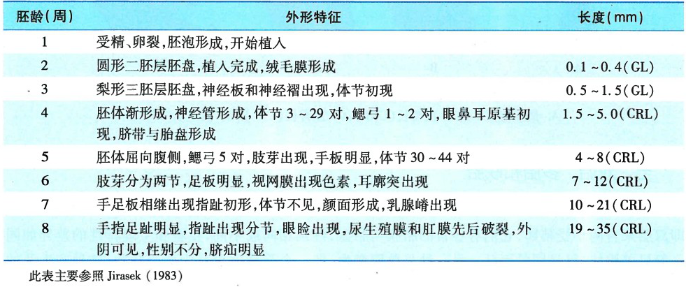 胚胎龄的推算通常有两种方式。一是通过月经龄,二是通过受精龄。临床上常以月经龄推算胚胎龄,即从孕妇末次月经的第1 天算起,至胎儿娩出共约40 周。但由于妇女的月经周期常受环境变化的影响,故胚胎龄的推算难免有误差。胚胎学者则常用受精龄,即从受精之日为起点推算胚胎龄。受精一般发生在末次月经第1 天之后的2 周左右,故从受精到胎儿娩出约经38周。但是,获得的人胚胎标本大多缺乏产妇月经时间的准确记录,造成胚胎龄推算的困难。因此胚胎学家根据大量胚胎标本的观察研究,总结归纳出各期胚胎的外形特征和长度,以此作为推算胚胎龄的依据。如第l~3 周,主要根据胚的发育状况和胚盘的结构;第4~5 周,常利用体节数及鳃弓与眼耳鼻等原基的出现情况;第6~8 周,则依据四肢与颜面的发育特征。胎龄的推算,主要根据颜面、皮肤、毛发、四肢、外生殖器等的发育状况,并参照身长、足长和体重等。胚胎长度的测量标准有三种:①最长值(greatest1ength,GL),多用于测量第1~3 周的胚;②顶臀长(crown—rump 1ength,CRL),又称坐高,用于测量第4 周及以后的胚胎;③顶跟长(crown heal 1ength,CHL),又称立高,常用于测量胎儿.